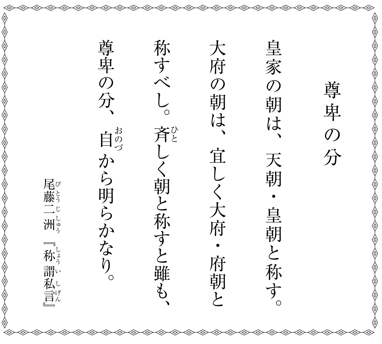 江戸時代の儒学者の中には、幕府を実質的な君主とし、甚だしきは朝廷を「山城天皇」と、地方の一領主の如くに書する者も現れた。尾藤二洲は、幕府の儒員でありながら、さうした君臣名分の乱れを正し、皇室こそが我が国の中心であることを示すべく、この『称謂私言(しょうげん)』の