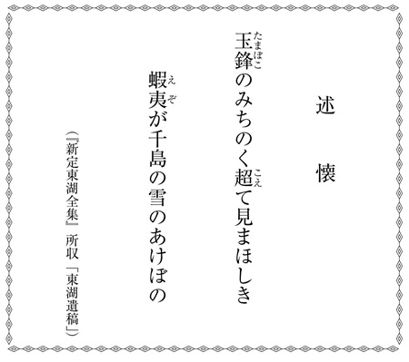 この歌は、水戸の藤田東湖が禁錮中の時、蝦夷地の探検に出かける伊勢の松浦武四郎に贈つた。これを武四郎は、弘化三年八月二日、知しれ床とこに到達し国くな後しり島から上る日の出を拝しながら二三度口詠したと蝦夷日誌(二)に記す。アイヌと寝食を共にしながら六回も踏査して詳細な地図を作製し、明治二年、北海道の名付け親となつた。明日への希望を抱かせる一首である。