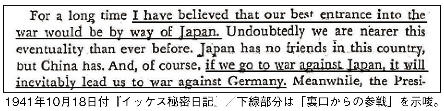 内務長官イッケスは、日米開戦の要因となった対日石油全面禁輸の実質的責任者です。その日記で、アメリカが参戦する最良の道は、「ドイツと軍事同盟を結んでいる日本と開戦することで、必然的にドイツとの戦に導くことになる」と記しており、まさに策略的な発想です。