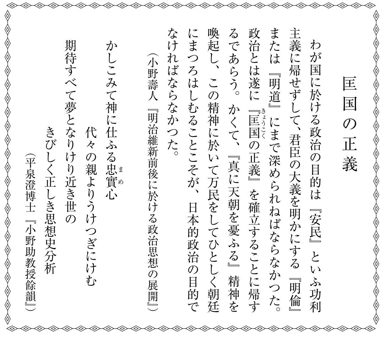 東大における平泉門下の俊秀の一人である小野壽人(ひさと)氏が昭和十九年十月に上梓した本書では、「天下の天下」といふ外来思想が江戸三百年間の咀嚼(そしゃく)・熟成を経て真の道義立国を目指す「一人の天下」といふ日本的理念へと転化し、明治維新の原動力となつたにもかかはらず、その後の西洋思想の奔流により再び抽象的理念である「天下の天下」へと逆転していつた過程を詳細に跡づけて居る。著者はその中で先人の思想に対する徹底せる究明、そして内在的批判に基づく公正なる論断を通じて西洋流民主主義のみならず東洋的民本主義の本質をも剔抉(てきけつ)し、真の日本思想、外国の受け売りでなく自国の歴史と伝統との中より自づと湧き出づるものとの差異を明晰に解き明かすのであるが、ただその本旨はあくまで国民が心を一つにし、国家の本然に復することにより当時日本が直面して居た危殆と混迷とを匡救(きょうきゅう)せんとするにあつた。